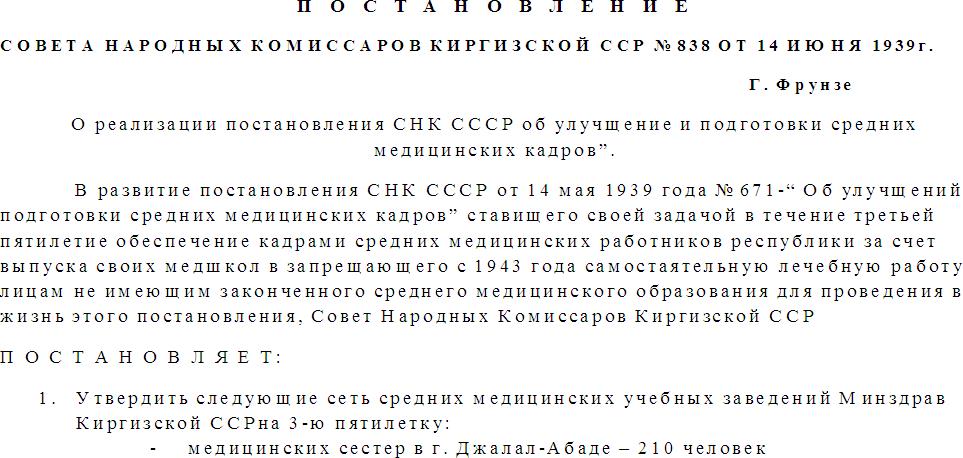 Октябрь революциясына чейин Кыргызстанда Саламаттык Сактоонун денгээли эң төмөн болгон. Кыргызстандын аймагында 15 врач, 30 орто билимдин медицина кызматкерлери эмгектенген. Советтик доордо Саламаттык Сактоого өзгөчө көңүл бурулган. Дарылоо мекемелери көбөйгөн сайын медициналык кадрларды даярдоо зарылчылыгы пайда болгон. Ошондуктан 1939-жылдын 26-мартында Кыргыз ССР БКнын чечими менен Жалал-Абад шаарында медициналык мектеп (мед. сестралардын мектеби) ачылган.