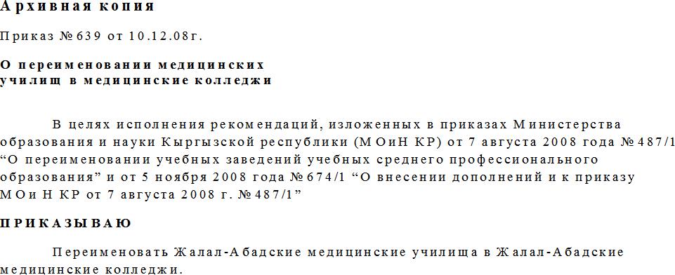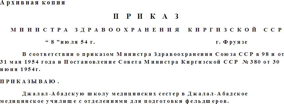 1954-жылы Кыргыз ССРнин Саламаттык Сактоо Министрлигинин №102 – 08.07.54 буйругунун негизинде медициналык мектеп, медициналык училища болуп өзгөргөн.