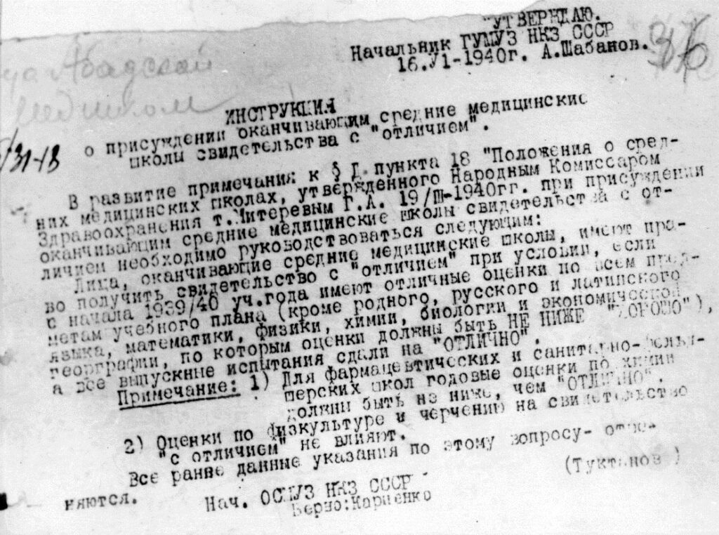 Алгач 35 гана окуучу кабыл алынып, окуу планы боюнча көрсөтүлгөн предметтердин саны 20 болгон. Жетинчи классты бүткөндөр кабыл алынган, жатакана менен камсыздалган, жетишкендигине жараша стипендия алышкан. Орто медициналык мектепти бүткөндөргө күбөлүк берилген. Артыкчылык шарттары да каралган. Стипендия бардык окуучуларга берилген, анын өлчөмү курсуна жараша айырмаланган жана отличниктерге 25% кошумча берилген.