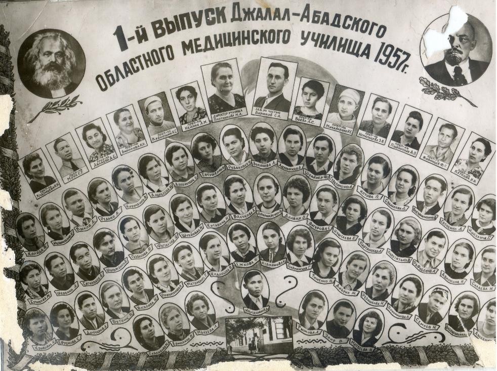 1940-жылы 27 медсестра даярдалып чыгарылган. Улуу Ата-Мекендик согуш учурунда Жалал-Абад шаарында үч эвакогоспиталь жайгашкан. Жарадар жоокерлерди, офицерлерди багып кароодо, дарылоодо биздин бүтүрүүчүлөр чон кызмат өтөгөн. 1954-жылга чейин окуу жай тарабынан 459 адис даярдалып, алардын 439 сестра медицина жана 20 фельдшер адиси болгон. Окуу жайдын алгачкы корпусу, азыркы областык басмакананын ордунда болгон